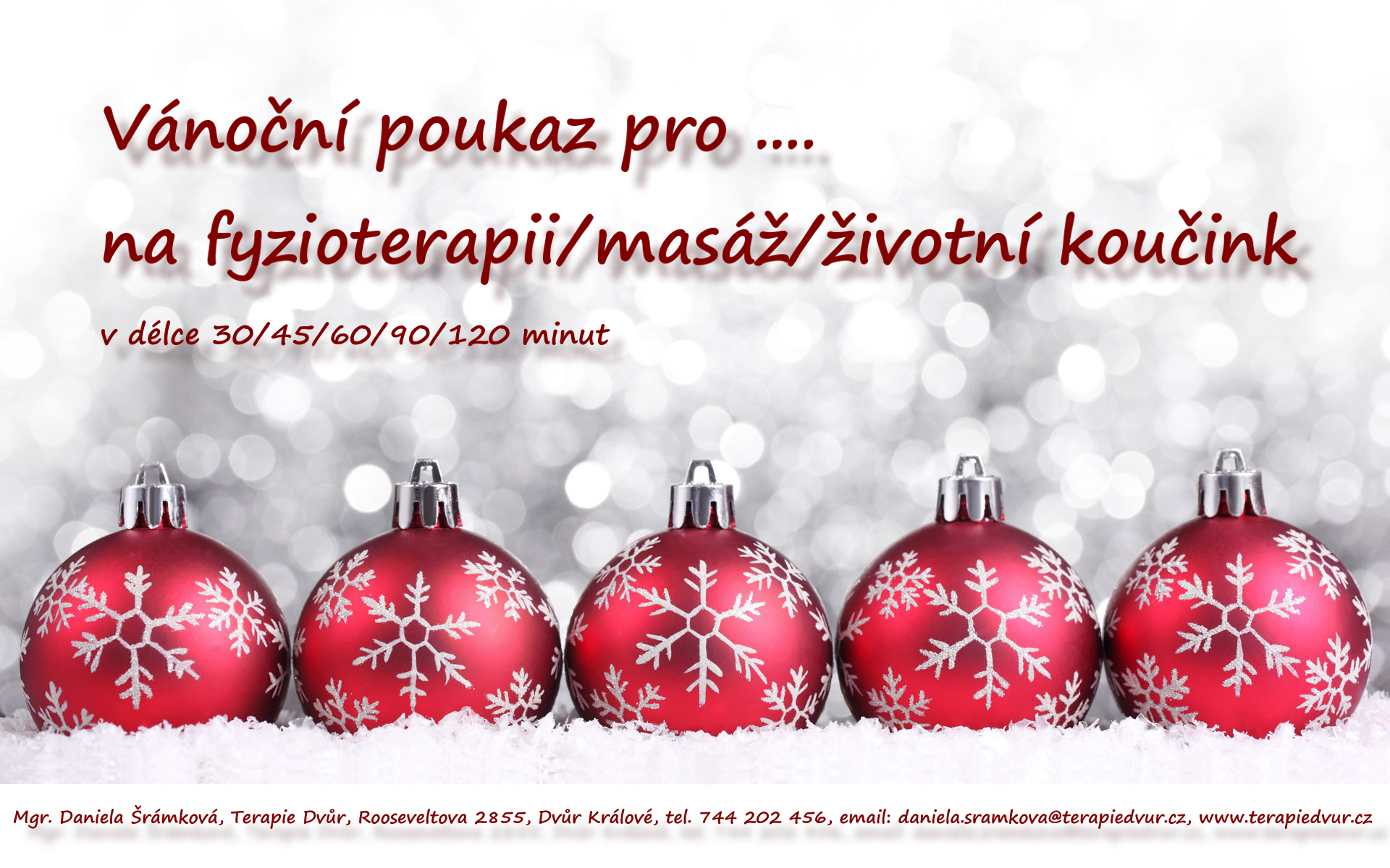 Věnujte svým blízkým péči o jejich zdraví, fyzickou a psychickou kondici. Připravila jsem pro vás několik tipů na vánoční dárek. Věnování Vánočního poukazu může obsahovat dle vašeho přání: